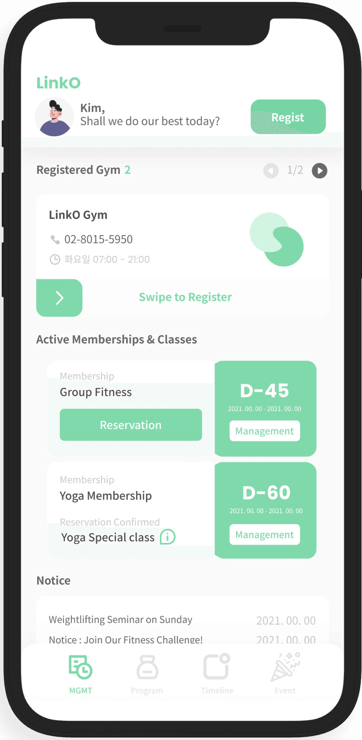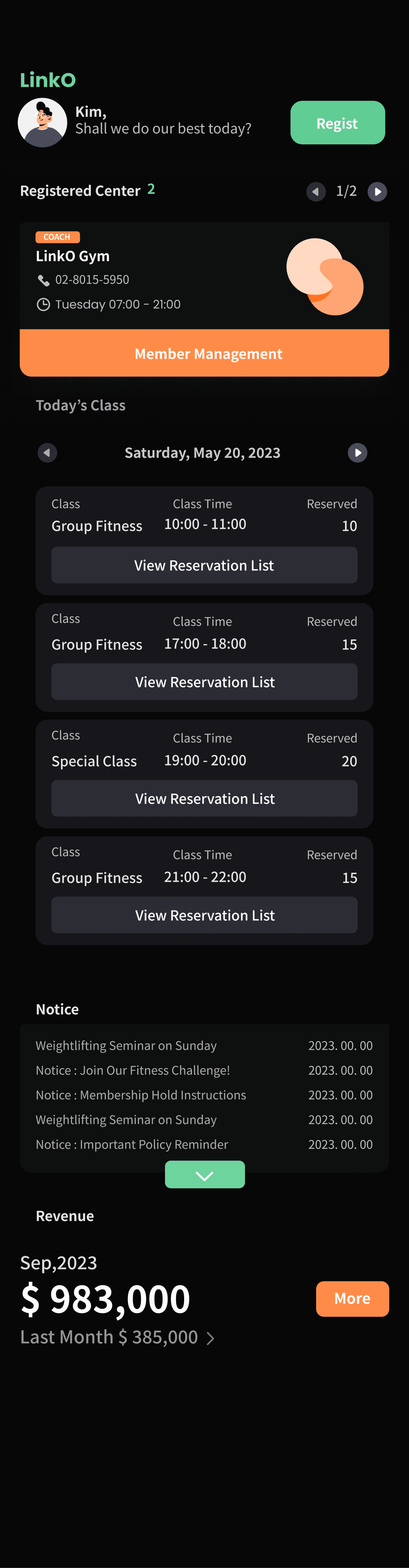 체육관 회원관리 타 앱들을 써 보면 ' 아 이건 운동안 하는 사람들이 만들었네 '이런 생각이 들 때가 많았어요. 하지만 링크코치는 정말 운동하는 모든 사람들을 위해 만들어졌다고 느껴질 만큼 그 씬에 대한 이해도가 높은 분들이 모여 만든 앱이라고 저는 생각합니다.