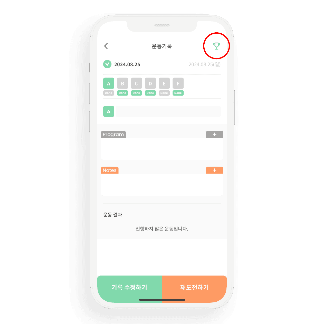 링코 app- 회원용 - 운동 기록하기링코 app- 회원용 - 운동 기록하기링코 app- 회원용 - 운동 기록하기운동을 기록할 운동 프로그램을 선택해 주셔야합니다.그전에 기록할 운동 프로그램이체육관에서 제공하는 수업인지나만의 운동인지 먼저 선택해 주세요기록할 운동 프로그램을 선택해 주세요하단의 [운동 시작하기] 를 눌러서 운동 기록을 시작합니다기록란에 결과를 기입하고 저장하기를 눌러주세요 ( 본와드 A 와 스케일 A-2 를 구별해서 기록해주세요)저장한 후 순위표를 확인하실 수 있어요오른쪽 상단 트로피 모형의 아이콘을 눌러주세요순위를 확인하실 수 있습니다.